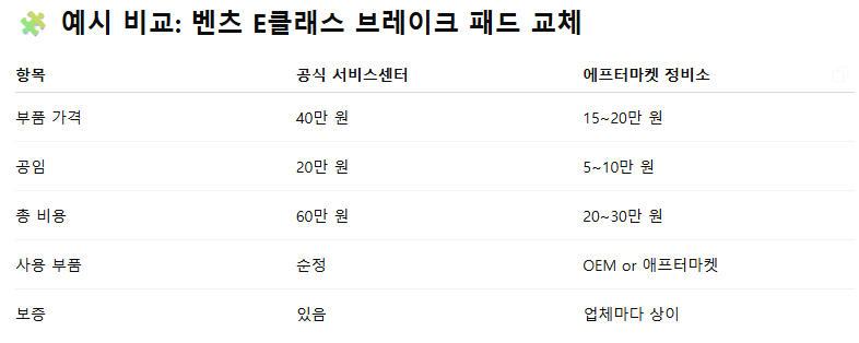 | 항목 | 공식 서비스센터 | 에프터마켓 정비소 |