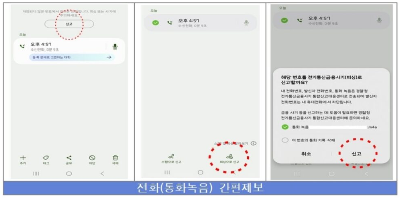 - 삼성 스마트폰: 문자/통화 기록 길게 누르면 “피싱으로 신고” 기능 제공